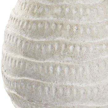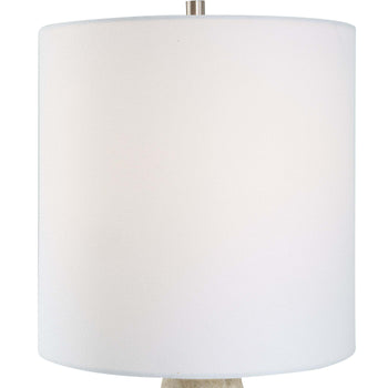 This organic shaped porcelain ceramic table lamp has a textured body, finished in an antique white wash, with brushed nickel accents. The drum hardback shade, with rolled edges, is an off white linen fabric.