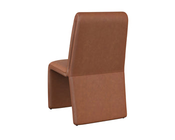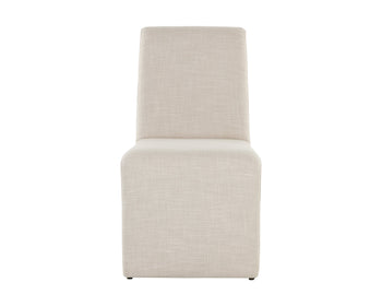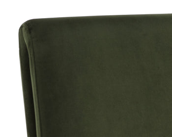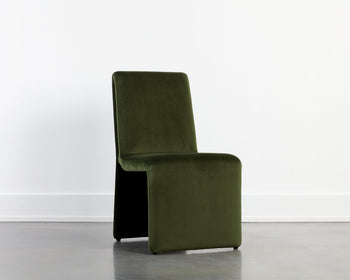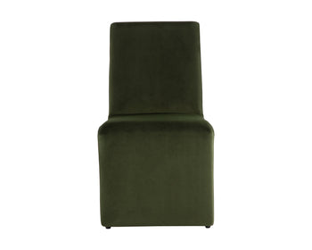 Create an alluring dining space with this modern dining chair that features an intriguing silhouette. Stocked in moss green fabric with a fully upholstered wooden base.