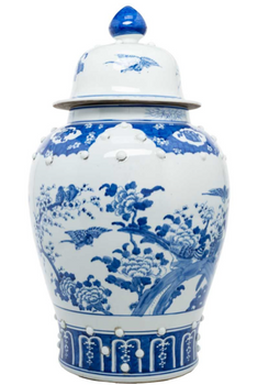 A truly grand ginger jar, exuding elegance at every turn. This impressive piece showcases a beautiful hand-painted antiqued scenery across its entire body, complemented by exquisite raised dots.
