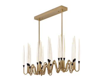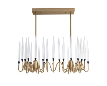 The Hestia Chandelier gives a nod to classic style. Cleverly crafted from an iron frame in a brushed gold finish. Acrylic rods sit atop the sinuous curves of the suspended fixture.