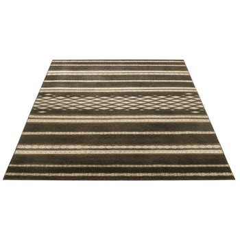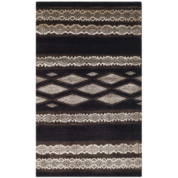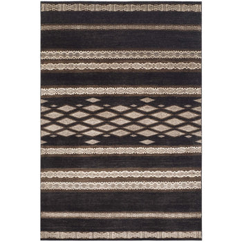 Crafted in India, this rug exudes a worldly charm and superior quality. The design inspires thoughts of exotic adventures with its intricate geometric and tribal patterns laid out in a stunning contrast of light and dark hues, blending seamlessly into its safari-inspired color palette. Perfect as a statement piece or a harmonious complement to your existing decor, this rug promises to elevate your home with its distinctive style and unparalleled craftsmanship.