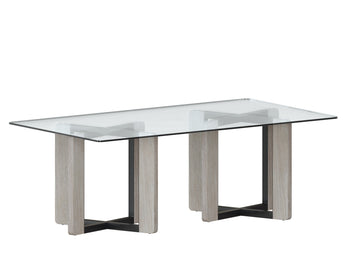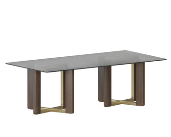 A beautiful dining table base that features contrasting brown solid mindi wood paired with a gold iron finish. Intended for use with a 59" round glass dining table top, or use two bases with a 96" glass top for a rectangular table combination. Table tops sold separately. Designed for use with glass table tops only. As wood is an organic, porous material, these pieces will contain natural variation of texture and may also exhibit fine indentations and cracks. Wood pieces will also display a disparity of colour and grain, and visible knots and burls that add to the character of each piece.