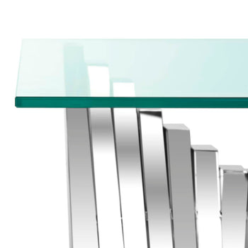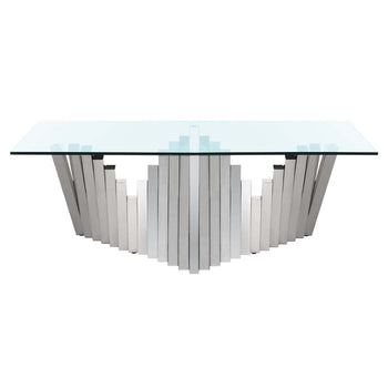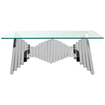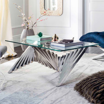Inspired by iconic sculptures in London's modern art museum, this contemporary Metal Coffee Table is alive with scale and movement. Crafted with glass and silver finished polished stainless steel, it makes a grand artistic statement in any living room.