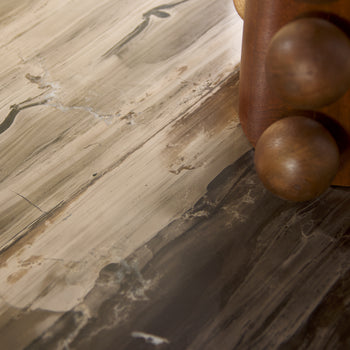 MARBLE CARE: Blot up spills immediately. Use coasters on tabletops under beverages. Use trivets or mats under hot dishes or cookware. Clean with warm water and dry surface immediately after cleaning. Do not use cleaners that contain acid such as bathroom cleaners, grout cleaners, and tile cleaners. Do not use abrasive cleaners in either dry or liquid forms. Use a cleaner and polish formulated for marble surfaces. CLEAN WITH DRY AND SOFT CLOTH