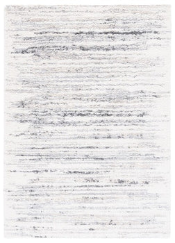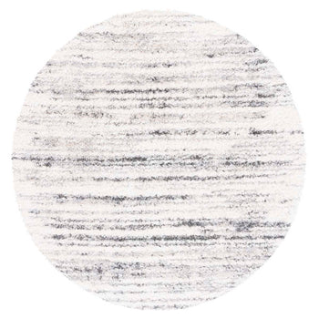 The rug's design features a captivating pattern with variegated horizontal stripes that offer a visual texture and depth to the grey tones upon the ivory background. This nuanced patterning adds a sense of movement and modernity that will complement a variety of home decors.