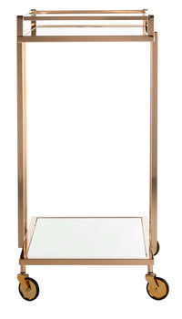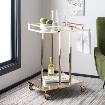 Whether it's transporting hors d'oeuvres or a melange of spirits at cocktail hour, this contemporary 2 tier rectangle bar cart is the doyenne of entertaining. Designed with a radiant gold finish and mirrored layers, it instantly upgrades any room.