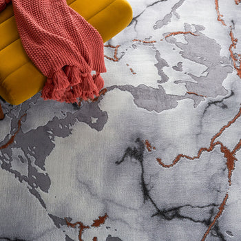 Crafted from a durable blend of 85% Polypropylene and 15% Polyester, this rug ensures long-lasting quality and easy maintenance. Its exquisite grey and orange color palette breathes life into the abstract, marble-like pattern shown in the image, adding a touch of modern elegance and vibrant contrast to any room.