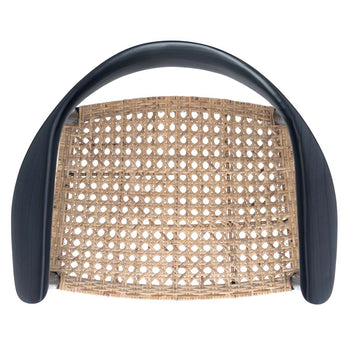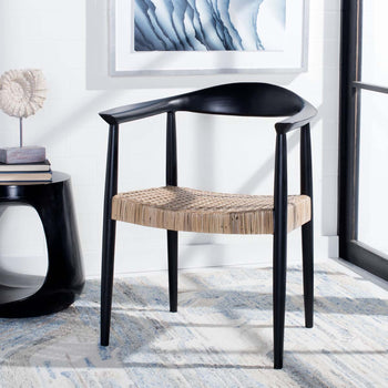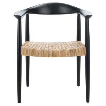 Teasing glimpses of Mid-Century chic with an iconic retro-inspired frame, this Eyre Accent Chair is a staple in any coastal-contemporary interior. Eyre's finely carved black wood, is given additional decorative depth with its intricately woven natural rattan seat.