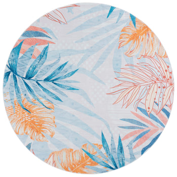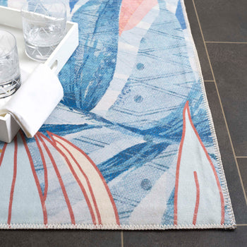 It is adorned with a luscious palette of blue and light blue hues, providing a serene yet vibrant backdrop for the tropical leaf patterns that dance across its surface. This durable rug, constructed from high-quality polyester, offers a washable convenience, ensuring long-lasting freshness and ease of maintenance.