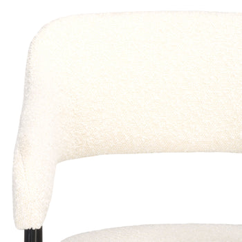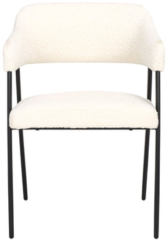 Add a stylish and cozy seat to your table with our Naoko dining chair. Offering a fresh take on mid-century designs, our dining chair impresses with its sleek and sophisticated profile. It's streamlined and subtly curved back and arms are padded to offer a dose of comfort. The rich white boucle upholstery creates an eye-catching contrast with the slender, black steel legs. Both airy and plush, our dining chair offers a perfect blend of style and comfort. It remains a stunning addition anywhere from the kitchen and dining to your home office.