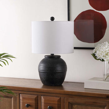 Illuminate and beautify your home with the grace and sophistication of our Naturi table lamp. Enriched with classic details and contemporary sensibilities, our table lamp stands out with its timeless aesthetics. Its voluminous black base attains character with a beautiful ribbed detail. Our table lamp is finished off with a contrasting white drum shade to add warmth and character to your nightstand, console, or side table.