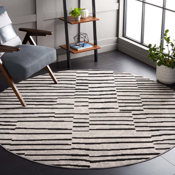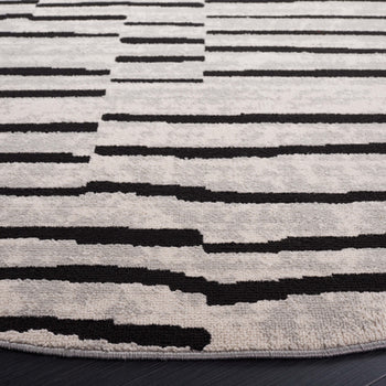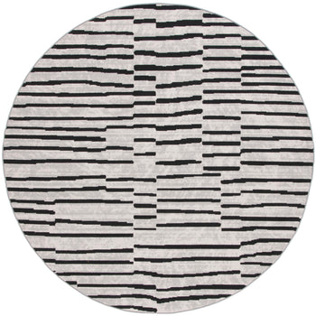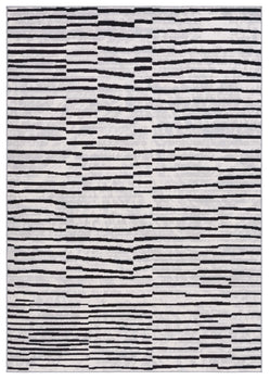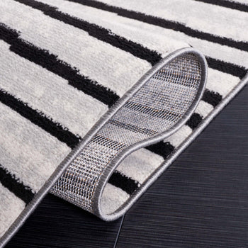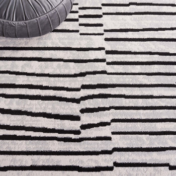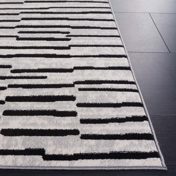 The palette of chic grey and bold black creates a visually captivating canvas. Upon examining the image, the rug's modern pattern comes to life ? a rhythmic composition of irregular, organic lines that dance across a neutral background, offering an artistic, urban vibe that is both extraordinary and subtle.