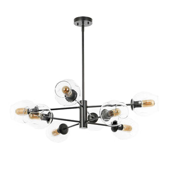 Brighten up your home with the eye-catching drama and elegance of our Pythea chandelier. Its sweeping arms propagate in different directions to deliver a dynamic and captivating ceiling light. Completed with clear glass shades and a sleek black finish, our chandelier makes a chic statement in an entryway, dining room, or open-plan lounge. Our gorgeous, 8-light chandelier creates a stunning display of each bulb to illuminate your home with a dose of warmth and style.