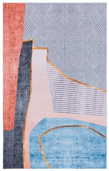 The rug's design features an intricate pattern composed of geometric shapes and varied textures, creating an engaging visual landscape underfoot. Each shape is defined by careful color blocking and subtle line work that adds depth and dimension to the abstract composition.
