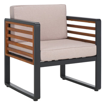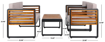 Introducing the VESTA 4 PC Outdoor Living Set ? your perfect choice for relaxing and entertaining outdoors. This stylish and versatile set features a harmonious blend of colors with black steel frames, natural wood accents, and light grey cushions, creating a chic and contemporary look for your patio, deck, or garden.