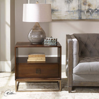 Uttermost's Tables Combine Premium Quality Materials With Unique High-style Design.With The Advanced Product Engineering And Packaging Reinforcement, Uttermost Maintains Some Of The Lowest Damage Rates In The Industry. Each Product Is Designed, Manufactured And Packaged With Shipping In Mind. Versatile Function With Modern Styling, Fully Finished In A Dark Walnut Over Walnut Veneer. Features An Open Pass-through For Decorative Storage And A Pull-out Drawer With An Embossed Metal Pull Finished In Antique Brass, Set Atop A Brushed Brass Open Framed Iron Base.