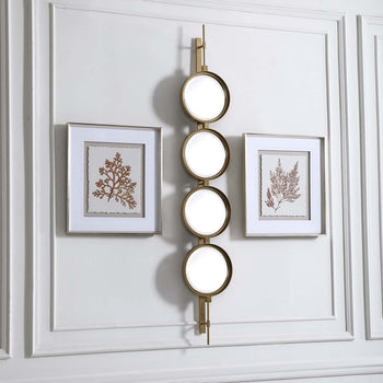 Contemporary In Style, This Mirror Features A Sleek Iron Base With Linear Metal Accents. The Piece Is Finished In Gold Leaf With Four Round Beveled Mirrors. Group Multiple Pieces Together And Hang Horizontal Or Vertical To Create A Truly Unique Wall Feature.