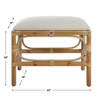 A Refreshing Coastal Accent Featuring A Crisp White Textured Fabric, Over A Naturally Finished Solid Wood Base With Rattan Wrapped Accents. Perfect Doubled Up At The Foot Of A Bed Or Under A Console Table.