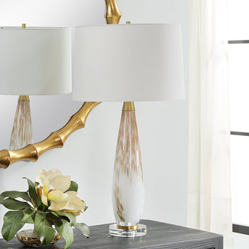 This Sleek And Slender Glass Base Features A Brilliant White Background With Spotted Metallic Gold Detailing Displayed On A Thick Crystal Foot And Paired With Plated Brushed Brass Accents.
