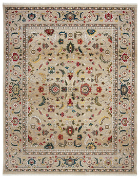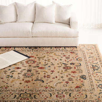 Featuring a rich array of colors set against a warm beige backdrop, the intricate pattern exudes a traditional aesthetic that complements both classic and contemporary decors. The design consists of elegant floral motifs intertwined with ornate borders, creating a compelling focal point that captivates and delights.