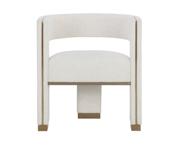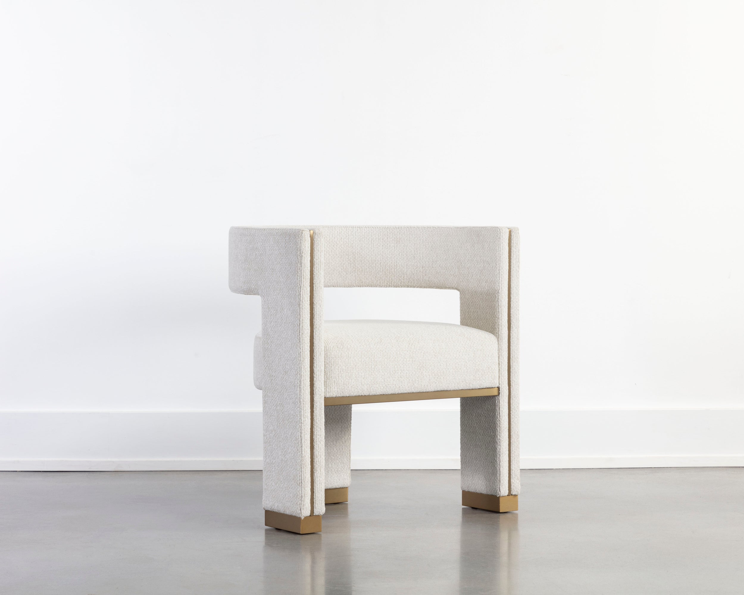 Perfectly poised with a distinct three-legged design, the Adamina Dining Armchair will leave a lasting impression. Powder-coated gold metal detailing enhances the plush texture of our rhea light barley performance fabric for a stylish seating solution. Performance fabric is moisture repellent, durable and easy to clean.