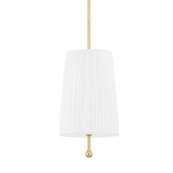 Prim and proper, Adeline shines with fine feminine details. An elongated aged brass stem peeps through the bottom, grounding the design. The white fabric shade features exquisite pleating, lending a crisp quality to the transitional wall sconce and pendant.