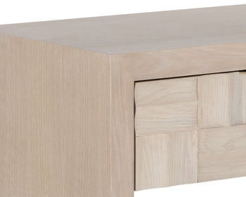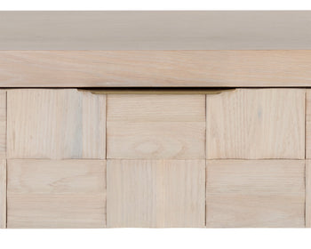 The Akava Nightstand will add intrigue to any bedroom space. Features a minimal linear frame crafted with a light oak wood veneer. Wood tiling on the front drawer brings texture and visual interest to the overall look. Completed with light gold aluminum handles and a matching steel base. As wood is an organic, porous material, these pieces will contain natural variation of texture and may also exhibit fine indentations and cracks. Wood pieces will also display a disparity of colour and grain, and visible knots and burls that add to the character of each piece.