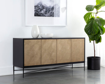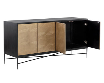 Infused with rich texture, this beautiful sideboard combines the timelessness of mid-century design with a modern twist. Features a solid mango wood frame with a black finish and complemented with champagne gold aluminum cladding on door fronts. Completed with a black iron base. Anti-tipping kit included. Made in India. With refined craftsmanship, this design was brought to life by skilled local artisans. By nature, these materials develop unique imperfections such as fissures, markings and color variations for a truly one-of-a-kind piece. As wood is an organic, porous material, these pieces will contain natural variation of texture and may also exhibit fine indentations and cracks. Wood pieces will also display a disparity of color and grain, and visible knots and burls that add to the character of each piece.
