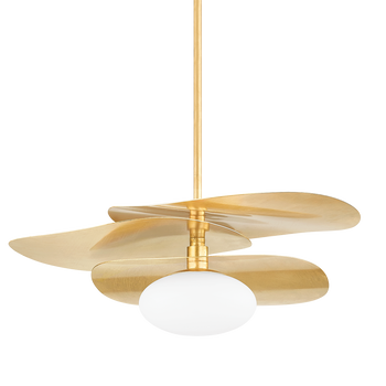 Three slender Vintage Gold Leaf shades are arrayed and layered above an opal matte glass diffuser for a botanical feel and organic style. The gentle circular forms of the shade pair perfectly with the soothing material choices. Light fills the diffuser with a soft glow that reflects gently off the metal above adding to the pendant's overall natural vibe.