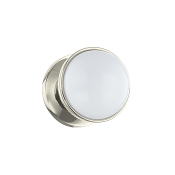 Opal glass spheres are held gem-like within a Polished Nickel or Aged Brass setting, bringing a modern jewelry aesthetic to the bath or powder room. The two-, three-, and four-light options are displayed within an elegant metal racetrack frame and can be mounted vertically or horizontally making them perfect solo above a mirror or in pairs alongside it.