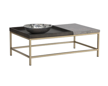 This coffee table is infused with rustic style and minimalist design elements. Features a solid oak wood tray top with an umber brown finish, a grey marble top, and a sleek brushed gold iron frame. Can be paired with matching console and end tables. As marble is a natural material, unique veining, pitting, fissures, micro-cracks and colour variations are all characteristics that add to the uniqueness and beauty of each piece.