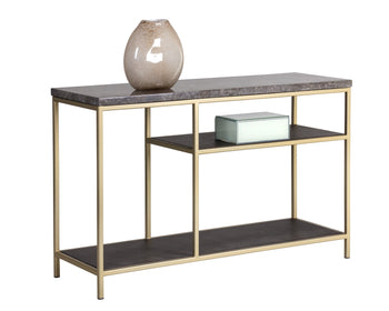 This console table is infused with rustic style and minimalist design elements. Features a grey marble top, oak wood shelves with a grey finish, and a sleek brushed gold iron frame. Can be paired with matching coffee and end tables. As marble is a natural material, unique veining, pitting, fissures, micro-cracks and colour variations are all characteristics that add to the uniqueness and beauty of each piece.