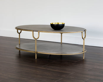 This oval shaped coffee table features a beautifully structured antique brass iron frame with a concrete top and shelf. A dramatic yet refined contemporary piece. Crafted from a natural concrete mix, each piece will look different. Variations in colour, texture, imperfections, surface scratches and non-structural hairline cracks are considered inherent and valued qualities of the material.