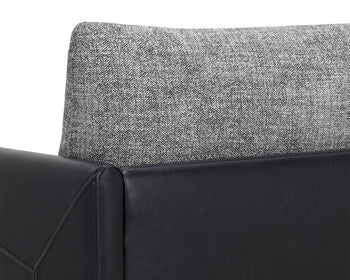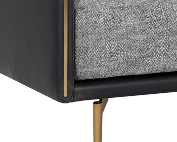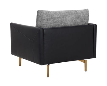 Mixed materials and contrasting colours give the Ashi Armchair an elevated design. Soft cushioning upholstered in nash zebra fabric provides ample comfort. Stitched detailing on the side of the arms gives a subtle geometric design that enhances the coal black faux leather frame. Satin brass aluminum on the legs and trim on the front of the arms ties the look together. Handle With Care: This design has been crafted with faux leather. Faux leather is manufactured to reflect the natural characteristics of leather; as such, colour variations, markings, wrinkles, grooves, and light scratches are appreciated characteristics. No two pieces will be alike. Visit our Product Care page for more information on how to ensure the lasting beauty of this piece.