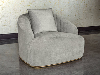 The beautiful lines of this chair will make a bold and comfortable statement in any space. Features a curved seatback with channel tufting in polo club stone performance fabric. Finished with an antique brass steel frame. Performance fabric is moisture repellent, durable and easy to clean.