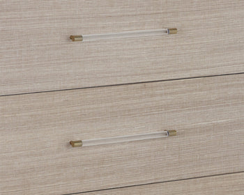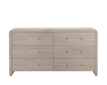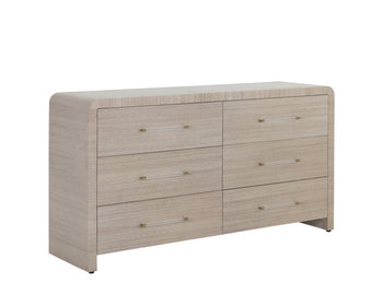 Fusing modern style with a design inspired by global travels, this richly textured dresser will add definition to any space. Crafted from a wooden frame with a sand raffia covering. Features six soft-closing drawers with steel and clear acrylic handles. Anti-tip kit included. Handle With Care: This design has been crafted with raffia. Each item will exhibit unique traits such as texture and thickness variations that add to the natural character of this finely woven material. Visit our Product Care page for more information on how to ensure the lasting beauty of this piece. As wood is an organic, porous material, these pieces will contain natural variation of texture and may also exhibit fine indentations and cracks. Wood pieces will also display a disparity of colour and grain, and visible knots and burls that add to the character of each piece.