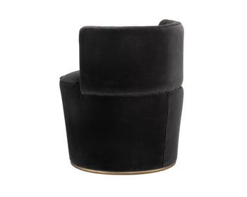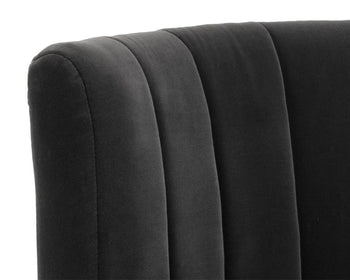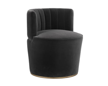 This alluring chair from features a curved seatback with channel tufting, and a comfortable rounded seat. Stocked in blush pink and shadow grey fabric with an antique brass frame. A beautiful addition to contract and residential lounge and living spaces.