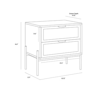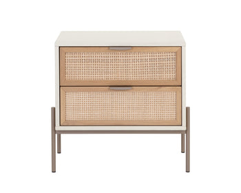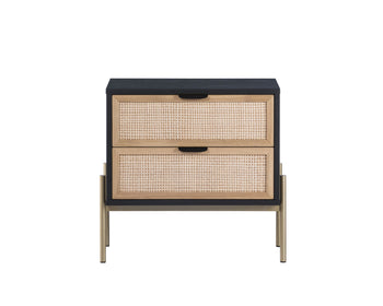 Create a bedroom influenced by global travels with this stylish nightstand crafted in Indonesia. Features two natural rattan drawers contrasted with a black oak wood frame. Gold iron feet and matte black steel handles complete the design. Handle With Care: This design has been crafted with rattan. This artisan-crafted material features intricate weaving that results in natural variations where no two pieces are alike. Colour and texture differences are to be expected and embraced with this natural material. Due to the weaving process used, the fibres in this material may display shorter or longer lengths where the weaving ends. Visit our Product Care page for more information on how to ensure the lasting beauty of this piece. As wood is an organic, porous material, these pieces will contain natural variation of texture and may also exhibit fine indentations and cracks. Wood pieces will also display a disparity of colour and grain, and visible knots and burls that add to the character of each piece.