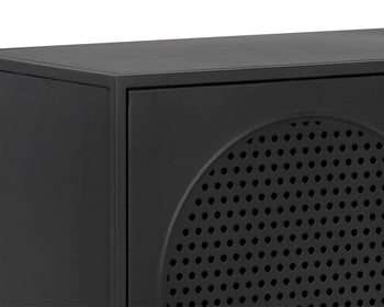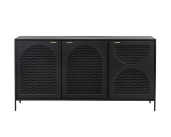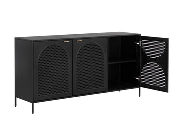 A timeless sideboard with a streamlined composition. Crafted with a black metal frame and completed with brass handles. Features open shelving and three cabinets with an arched perforated metal design. Pairs well with the Aziza media console and cabinet and nightstand. Made in India. With refined craftsmanship, this design was brought to life by skilled local artisans. By nature, these materials develop unique imperfections such as markings and colour variations for a truly one-of-a-kind piece.