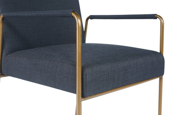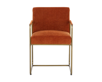 This dining armchair exudes an elegant mid-century style. The airy design and comfortable seat is suitable for lounge and office spaces. Stocked in danny rust fabric with an antique brass frame.