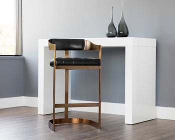 This ultra contemporary stool features a T-shaped back, tapered arms and an antique brass crown base. Stocked in cantina black bonded leather. Perfectly suited for commercial and residential settings. Suitable for various dining, kitchen and bar spaces of all sizes. Handle with Care: This design has been crafted with bonded leather. Bonded leather is a blend of reconstituted leather and synthetic materials crafted to reflect the natural characteristics of leather; as such, colour variations, markings, wrinkles, grooves and light scratches are acceptable and appreciated characteristics. No two pieces are alike. Visit our Product Care page for more information on how to ensure the lasting beauty of this piece.