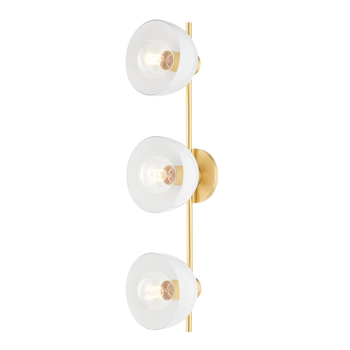 Cool contrast and fine form play well together in Belle's striking silhouette. The aged brass frame pops against the glossy white shades, featuring exposed bulbs for a futuristic effect. This 3-light bath sconce can be installed vertically or horizontally.