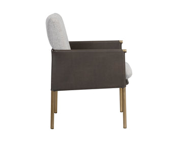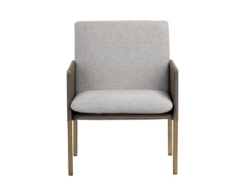 A beautiful upholstered lounge chair crafted with an intriguing mixture of textures and materials. Features a belfast grey fabric seat with a contrasting bravo ash faux leather exterior and antique brass frame. Can be paired with coordinating bench. Handle With Care: This design has been crafted with faux leather. Faux leather is manufactured to reflect the natural characteristics of leather; as such, colour variations, markings wrinkles, grooves, and light scratches are appreciated characteristics. No two pieces will be alike. Visit our Product Care page for more information on how to ensure the lasting beauty of this piece.