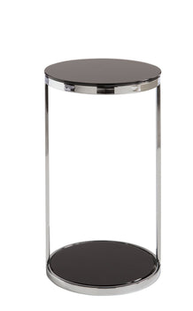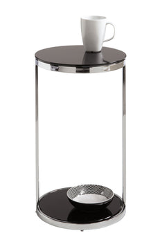 This end table features tempered black glass on a polished steel base. Perfect for compact spaces in both transitional and modern environments.