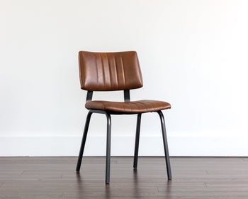 This versatile dining chair will seat guests in comfort and style. The industrial look is completed with a black steel frame and a channel tufted seat. Available in bravo cream faux leather. Handle With Care: This design has been crafted with faux leather. Faux leather is manufactured to reflect the natural characteristics of leather; as such, colour variations, markings wrinkles, grooves, and light scratches are appreciated characteristics. No two pieces will be alike. Visit our Product Care page for more information on how to ensure the lasting beauty of this piece.
