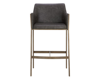 The Bernadette Barstool features a shapely design with a powder-coated antique brass frame. Upholstered in kendall grey faux leather for added style and durability. Handle With Care: This design has been crafted with faux leather. Faux leather is manufactured to reflect the natural characteristics of leather; as such, colour variations, markings wrinkles, grooves, and light scratches are appreciated characteristics. No two pieces will be alike. Visit our Product Care page for more information on how to ensure the lasting beauty of this piece.