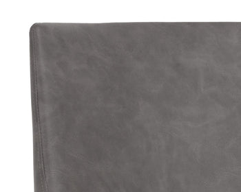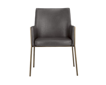 The Bernadette Dining Armchair features a shapely design with an exposed brushed antique brass frame. Upholstered in kendall grey faux leather for added style and durability. Handle With Care: This design has been crafted with faux leather. Faux leather is manufactured to reflect the natural characteristics of leather; as such, colour variations, markings wrinkles, grooves, and light scratches are appreciated characteristics. No two pieces will be alike. Visit our Product Care page for more information on how to ensure the lasting beauty of this piece.
