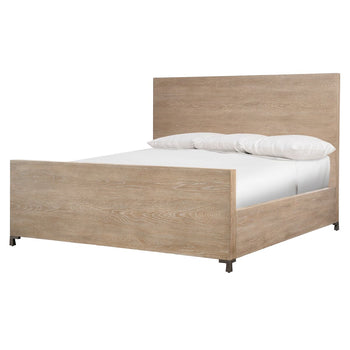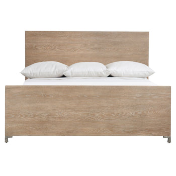Simple lines craft a quietly sophisticated look on the Aventura panel bed. Inspired by relaxed California style, the wood grain shines through the Marcona finish. Cast metal feet in a Frosted Nickel finish support the headboard and footboard for a chic rustic detail.