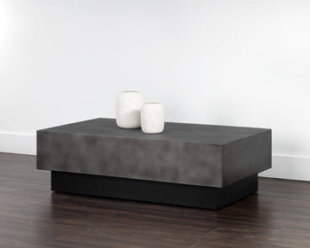 Turn heads with this contemporary, rectangular coffee table that features a bold design. Crafted with a gunmetal steel top and a matte black powder coated steel base. Made in India. With refined craftsmanship, this design was brought to life by skilled local artisans. Due to the nature of handcraftsmanship, unique imperfections such as fissures, markings and variations in colour and shape are welcomed and appreciated characteristics for a truly one-of-a-kind piece.