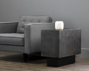 Turn heads with this contemporary, rectangular end table that features a bold design. Crafted with a gunmetal steel top and a matte black powder coated steel base. Made in India. With refined craftsmanship, this design was brought to life by skilled local artisans. Due to the nature of handcraftsmanship, unique imperfections such as fissures, markings and variations in colour and shape are welcomed and appreciated characteristics for a truly one-of-a-kind piece.